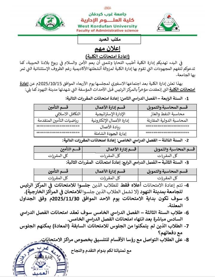 كلية العلوم الإدارية – جامعة غرب كردفان تعلن عن إعادة