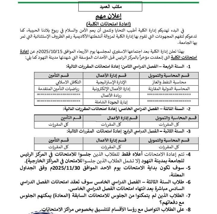 إعلان إعادة امتحانات كلية العلوم الإدارية