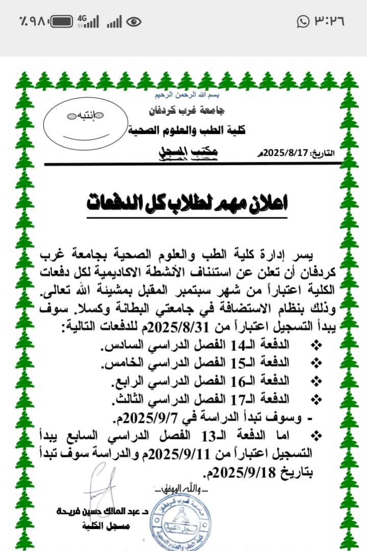 يسر إدارة كلية الطب والعلوم الصحية بجامعة غرب كردفان أن تعلن عن استئناف الأنشطة الأكاديمية للكلية اعتبارًا من شهر سبتمبر المقبل بمشيئة الله تعالى، وذلك بنظام الاستضافة في جامعتي البطانة و كسلا.