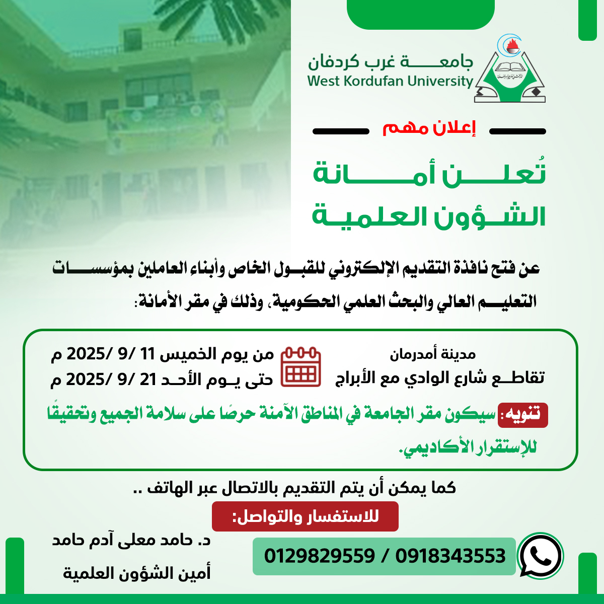 تُعلن أمانة الشؤون العلمية عن فتح نافذة التقديم الإلكتروني للقبول الخاص وأبناء العاملين بمؤسسات التعليم العالي والبحث العلمي الحكومية، وذلك في مقر الأمانة: