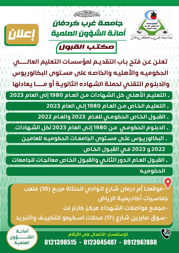 الإستفسار: الاتصال على الأرقام 0912967880 /0123045407 / 0121398515/