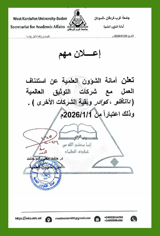 أعلنت أمانة الشؤون العلمية بجامعة غرب كردفان عن استئناف العمل مع شركات التوثيق العالمية