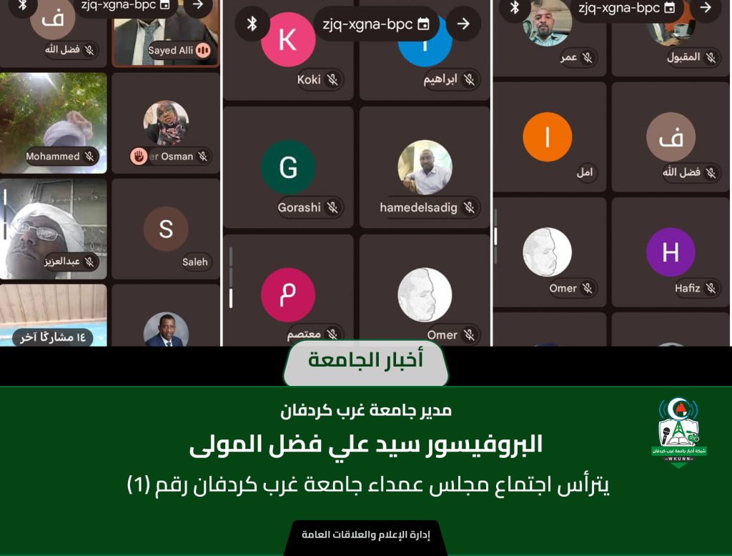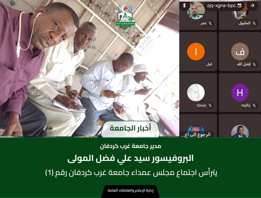 انعقد اليوم الاجتماع الأول لمجلس عمداء جامعة غرب كردفان، حضورياً واسفيرياً عبر منصة “قوقل ميت”، برئاسة مدير الجامعة الذي افتتح الجلسة مرحباً بالحضور، مؤكداً أهمية إجازة الهيكل التنظيمي ومتابعة الأنشطة الأكاديمية في هذه المرحلة التأسيسية.